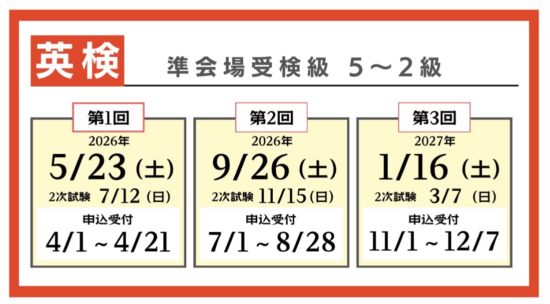アクトアカデミーは実用英語技能検定(英検)の準会場に認定されております。R8年度は上記日程で実施いたします。通塾…